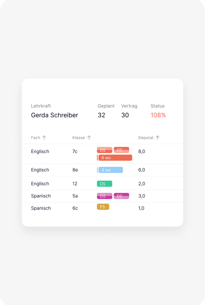 Planen Sie Ihren Unterricht effizient und präzise. Unsere Software zeigt Ihnen auf einen Blick, wie viele Stunden Sie gemäß Ihrem Vertrag unterrichten müssen und welche Fächer bereits belegt sind. Dank individueller Gewichtungen und Berücksichtigung Ihrer spezifischen Qualifikationen erstellen Sie mühelos optimale Stundenpläne. Bildung ist der Schlüssel zu einer besseren Zukunft. Mit unserer Plattform möchten wir Schulen dabei unterstützen, ihre Lehr- und Lernprozesse zu optimieren und die Kommunikation zu verbessern.