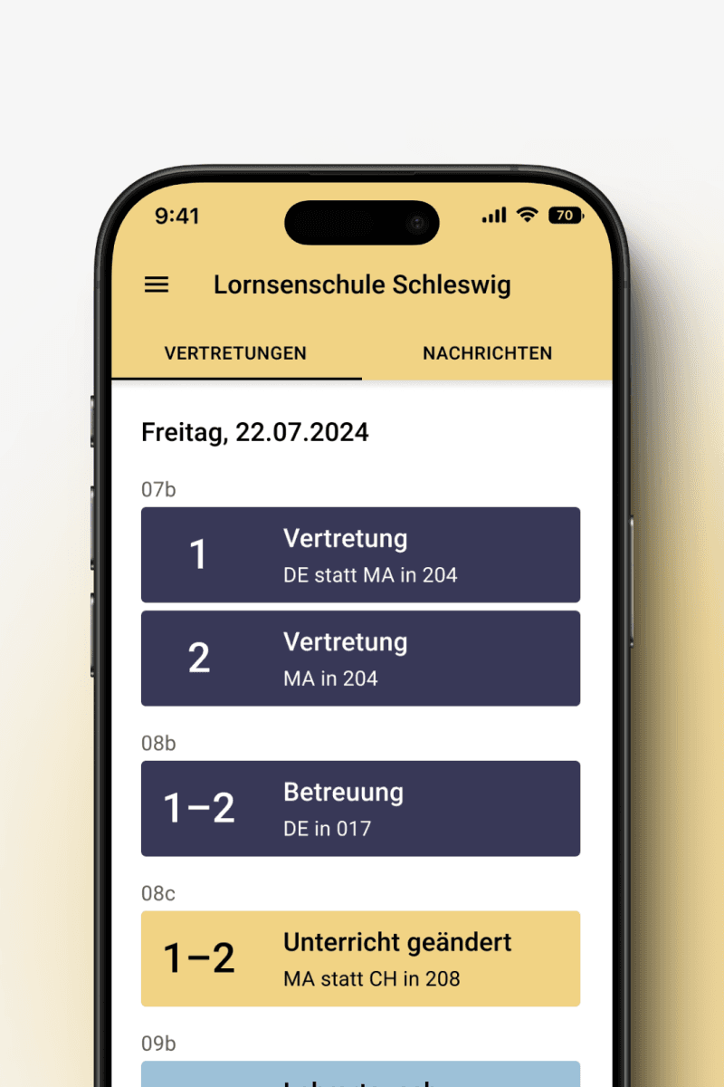 Mit der App haben Lehrkräfte und Schulleitung jederzeit Zugriff auf aktuelle Vertretungspläne – überall und in Echtzeit. Änderungen werden sofort angezeigt, sodass alle Beteiligten immer auf dem neuesten Stand sind. So bleibt Ihre Planung flexibel und zuverlässig.