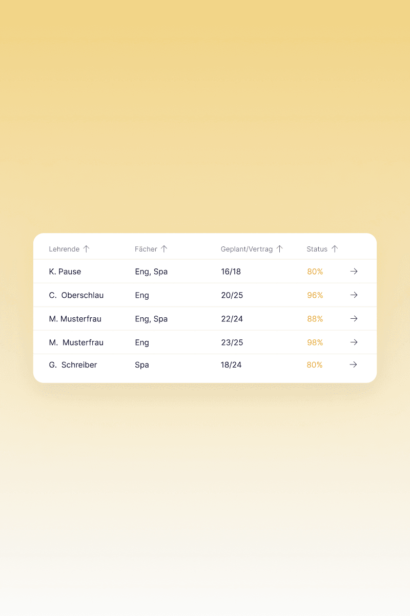 Mit nur einem Mausklick erstellen Sie detaillierte Deputatsübersichten für jede Lehrkraft, wichtige Kennzahlen für Schulleitung, Vorstand und Geschäftsführung sowie umfassende Excel-Exporte. So stehen Ihnen jederzeit alle relevanten Informationen für fundierte Entscheidungen zur Verfügung.
